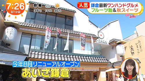 9/12(木)、フジテレビ系朝の情報番組「めざましテレビ」の『やってユカ!』コーナー内「鎌倉最新ワンハンドグルメ」で、あいざ鎌倉が紹介されました!